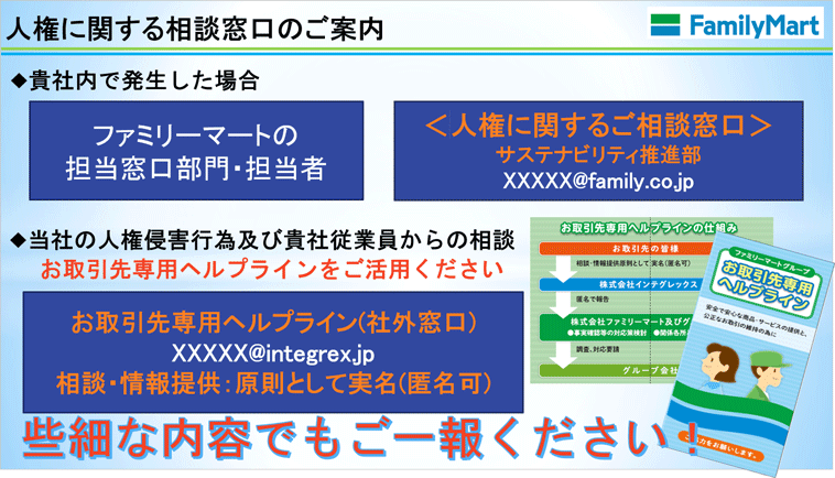 グループ会社の株式会社ファミリーマートでは、ファミリーマート店舗へ商品を供給している中食製造業者の雇用や労務に関する方針制定や実務に携わる管理者を対象に、人権リスクの未然防止と理解促進を目的として「サプライチェーンの人権課題に関する情報共有会」を定期的(年1回程度)に開催しています。